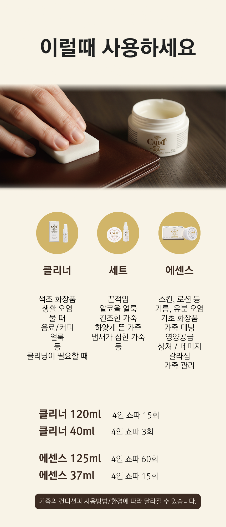 | 2. 용도(표백제의 경우 계열을 함께 표시) 및 제형 | 가죽 세정제 ( 펌프형식의 묽은 용액 형태) : 가죽의 오염을 세정하고, 닦는용도 가죽 영양크림 ( 찍어 바르는 밤 형태) : 가죽의 기본 오염 제거, 영양공급과 관리용 |
