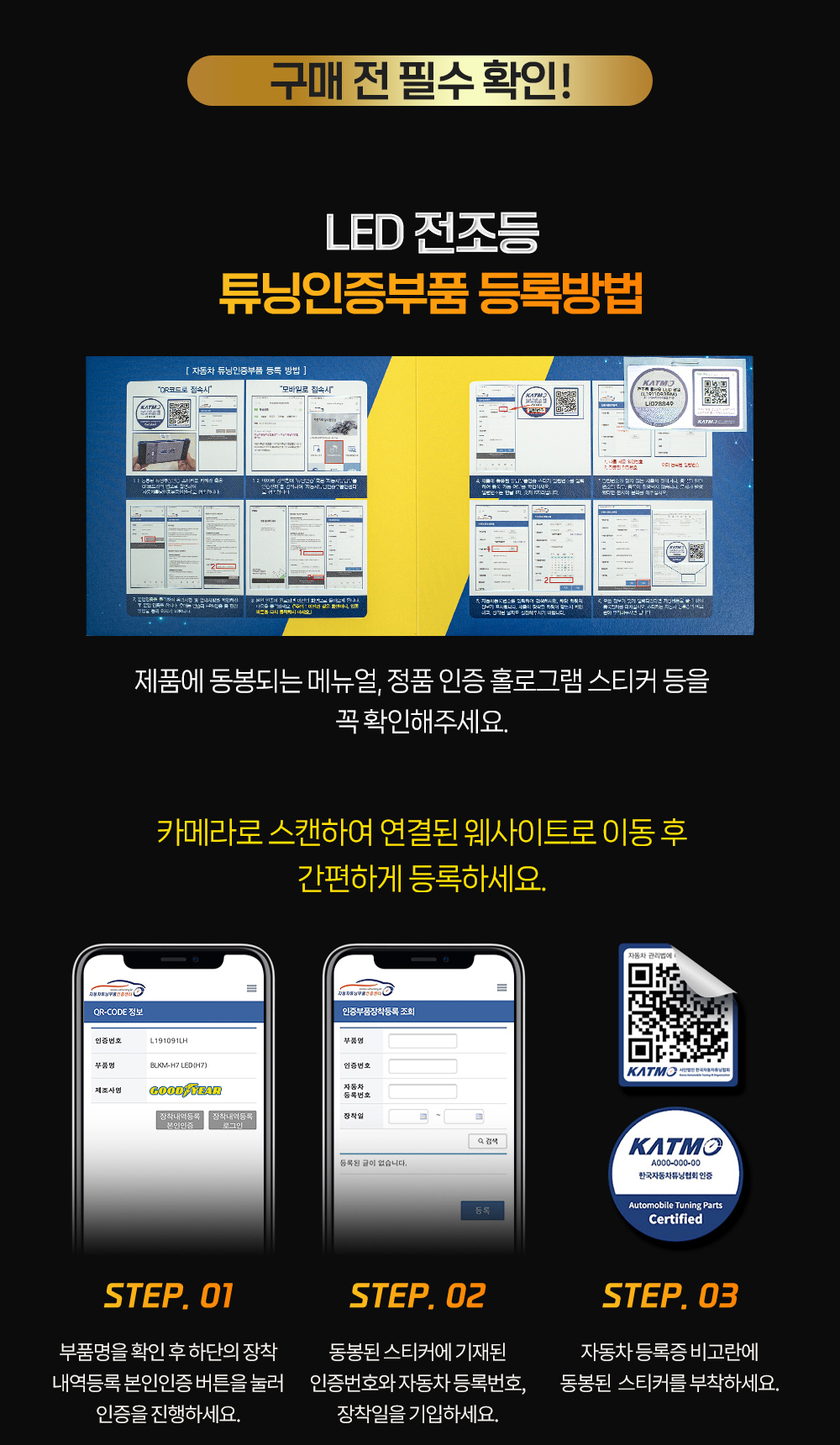 | 3. KC 인증 필 유무 (자동차관리법에 따른 자기인증 대상 자동차부품에 한함) | 한국자동차튜닝협회 KATMO 인증 / R-R-biL-LED-HB3_12V |