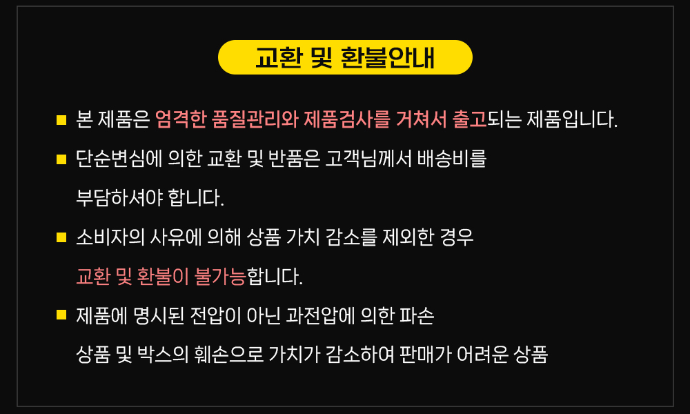 제품 수령시 초기 불량일 경우 반품 배송비가 청구 되지 않습니다.