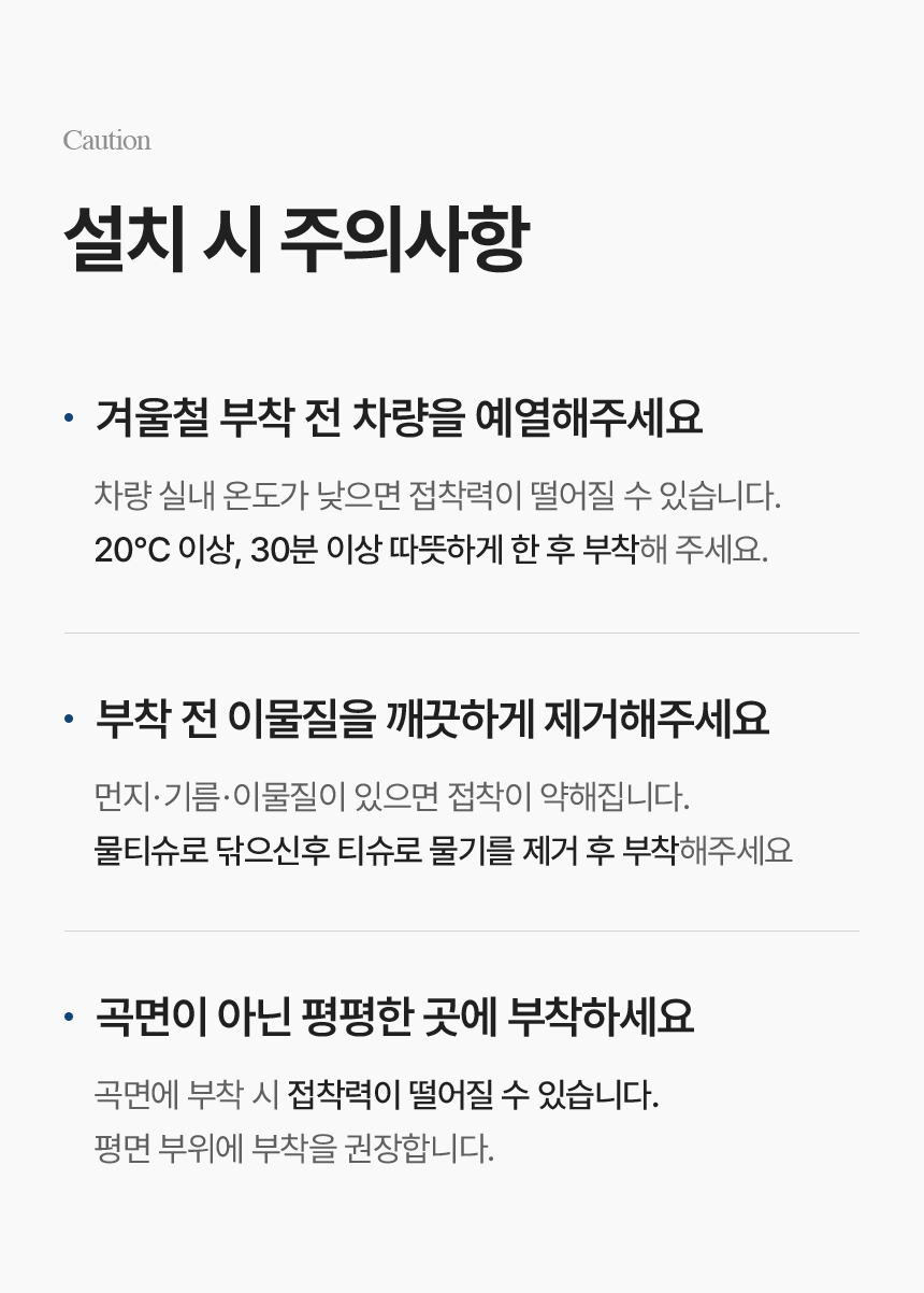 흡착·접착 제품은 부착 전 반드시 위치 확인 및 테스트를 권장드립니다.