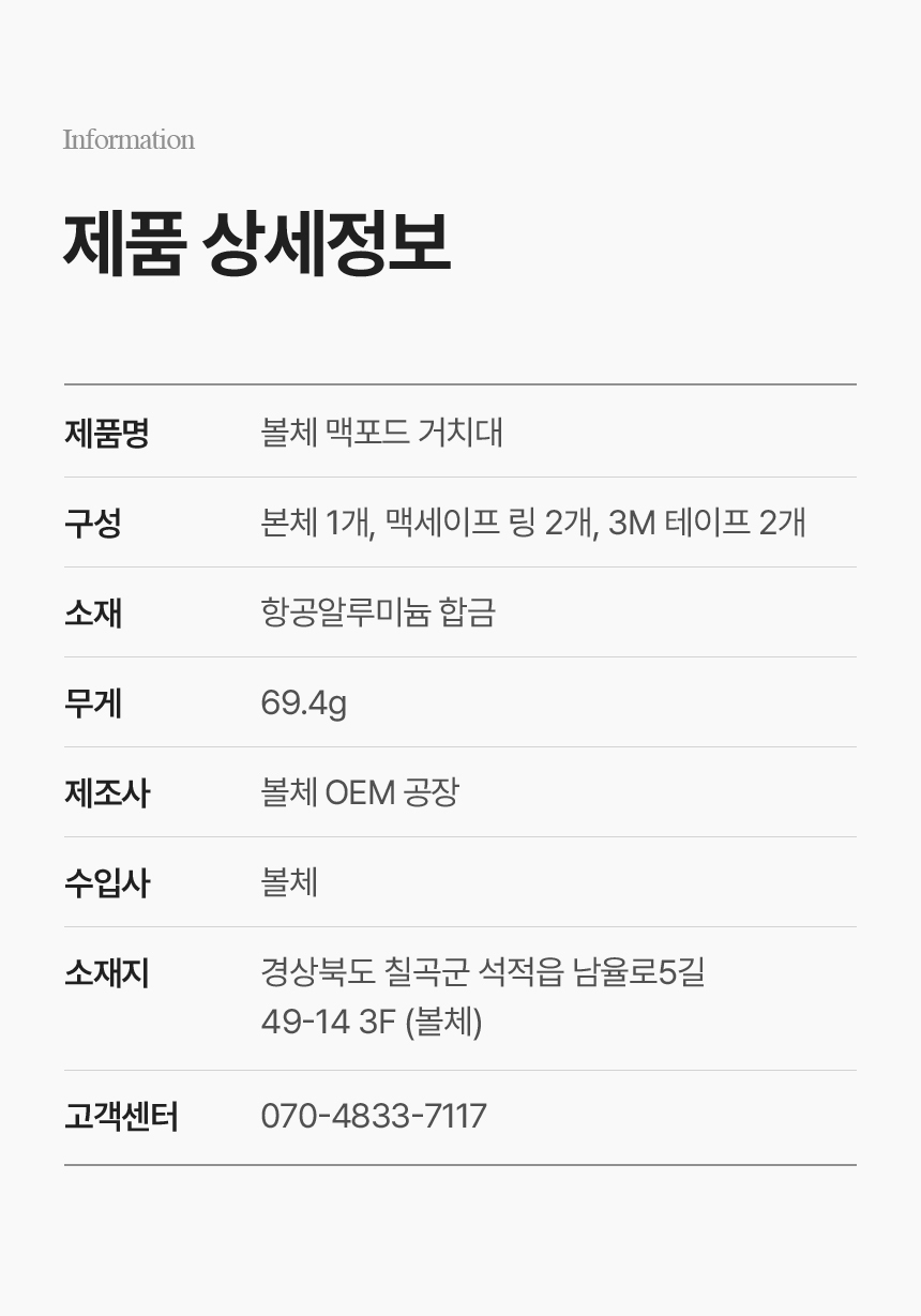 | 1. 품명 및 모델명 | 볼체 맥포드 거치대 / BC-MFH-01 |