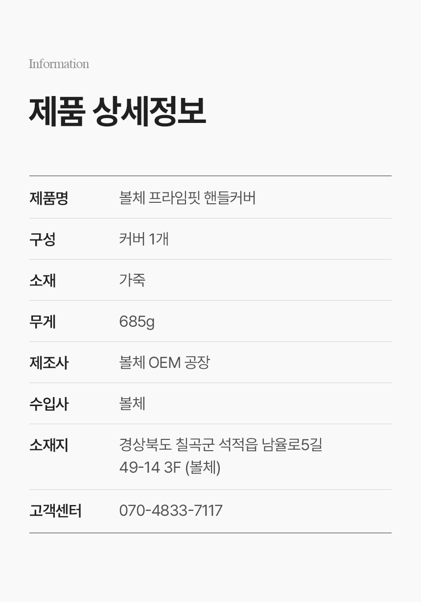 | 1. 품명 및 모델명 | 볼체 프라임핏 핸들커버 / BC-PFH-01 |