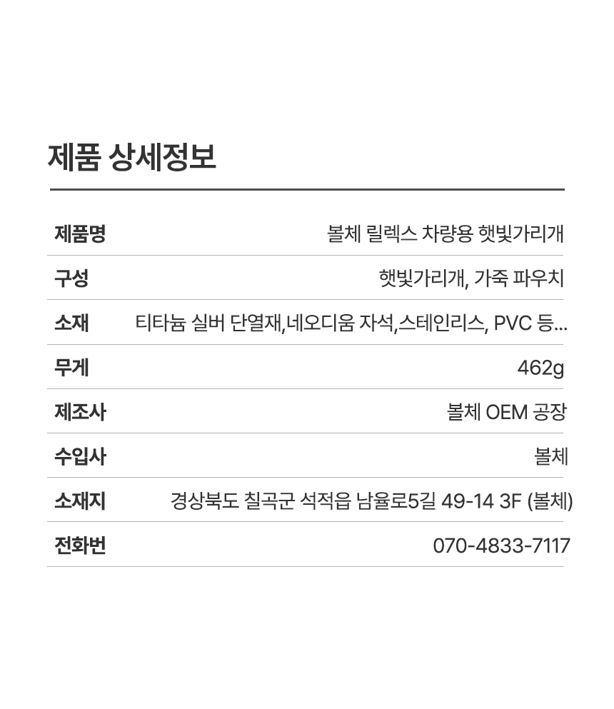 | 1. 품명 및 모델명 | 볼체 릴렉스 햇빛가리개 / BC-RVS-01 |