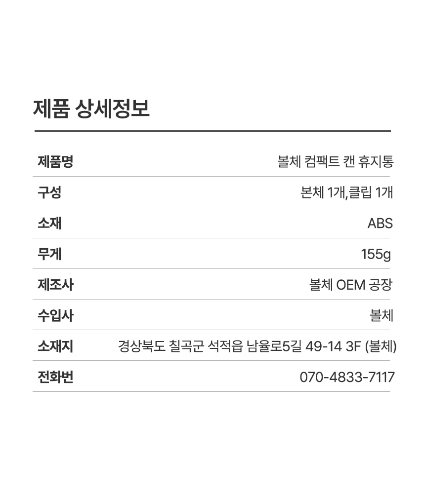 | 1. 품명 및 모델명 | 볼체 컴팩트캔 휴지통 / BC-CAT-01 |