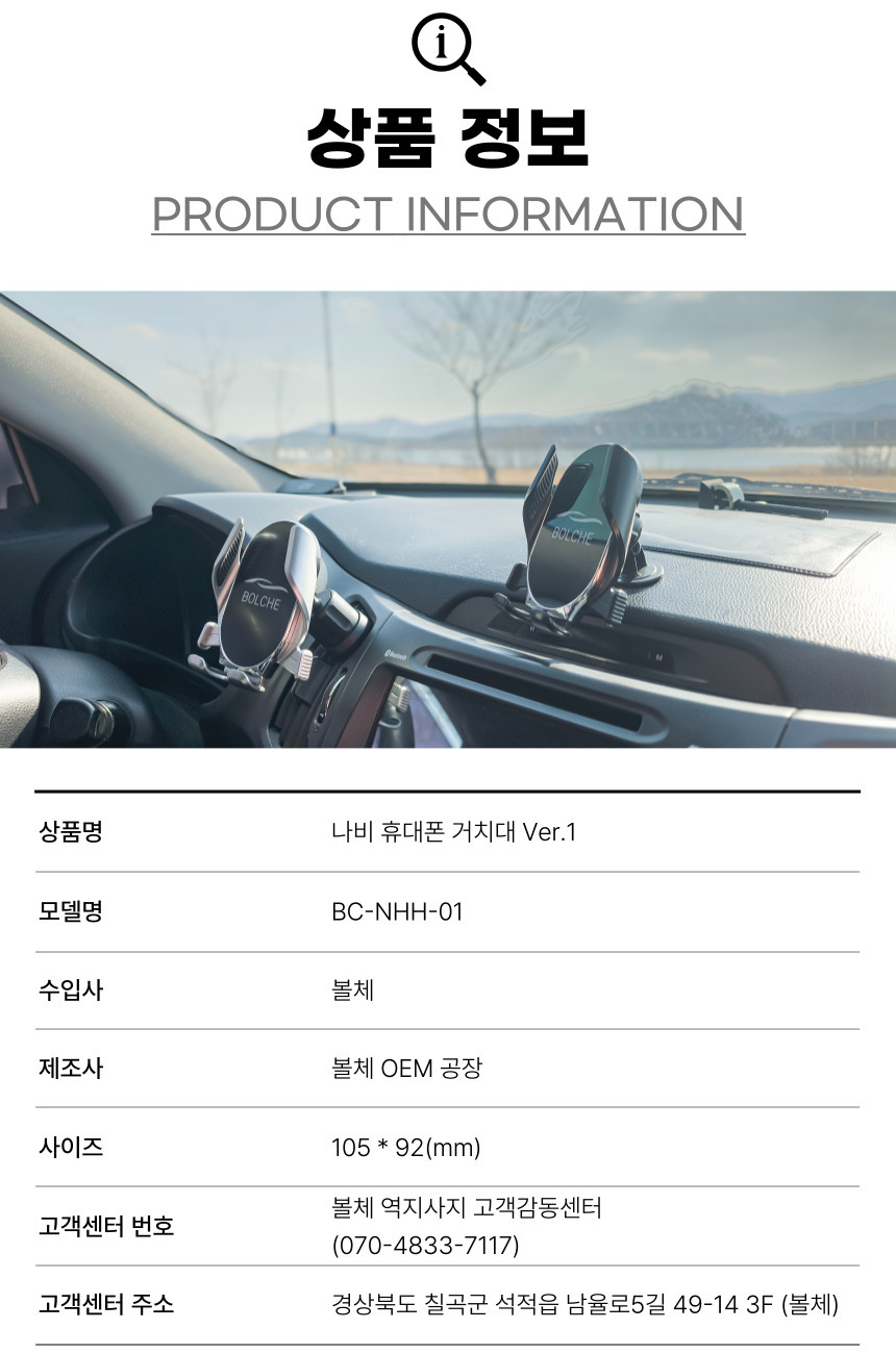 | 1. 품명 및 모델명 | 볼체 차량용 나비 거치대 ver.1 / BC-NHH-01 |