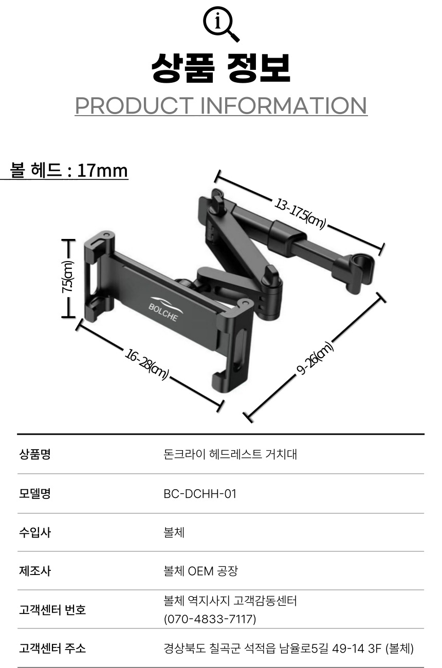 | 1. 품명 및 모델명 | 볼체 돈크라이 헤드레스트 거치대 / BC-DCH-01 |