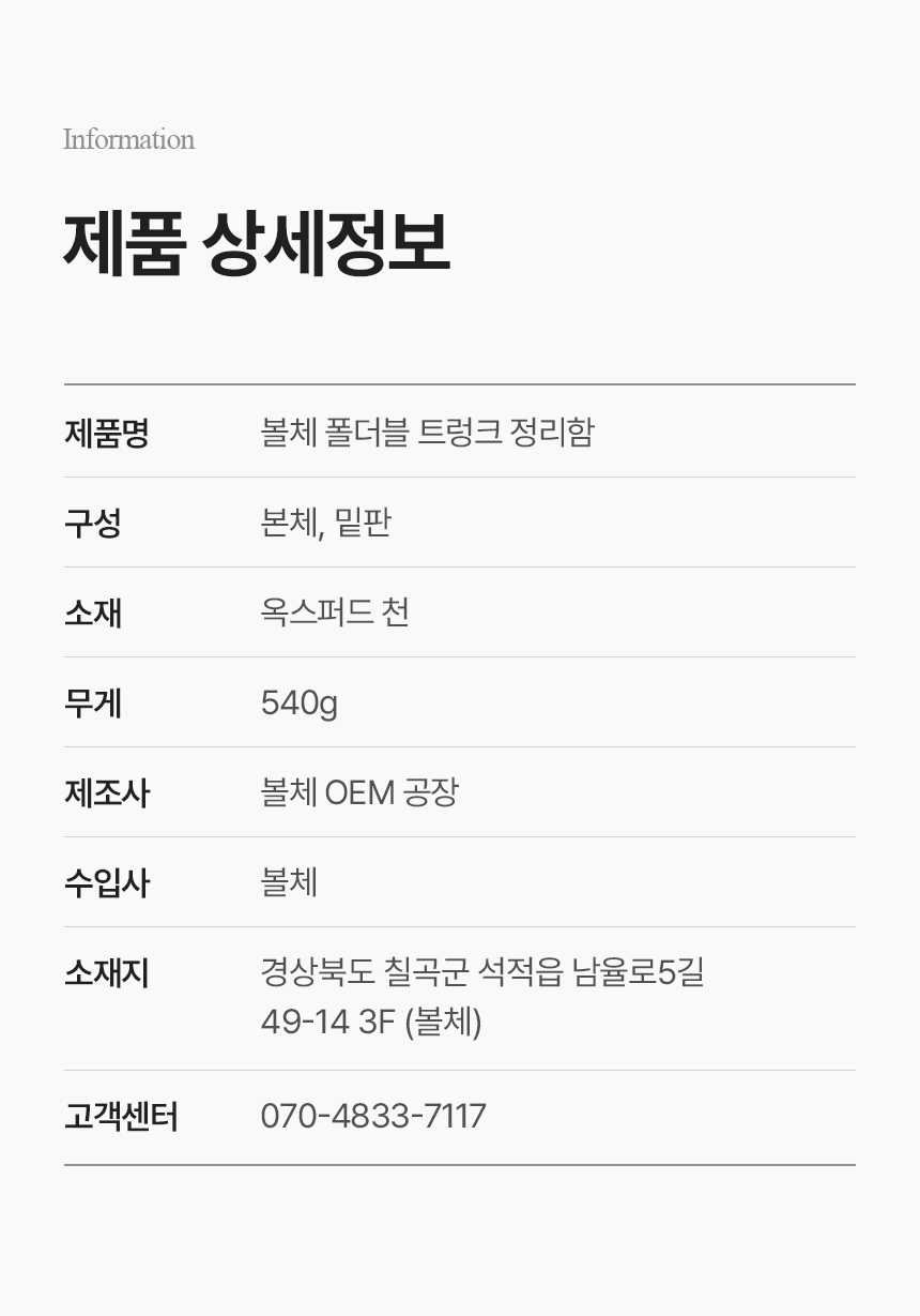 | 1. 품명 및 모델명 | 볼체 폴더블 오거나이저 / BC-FTO-01 |