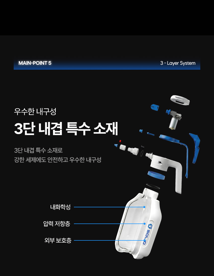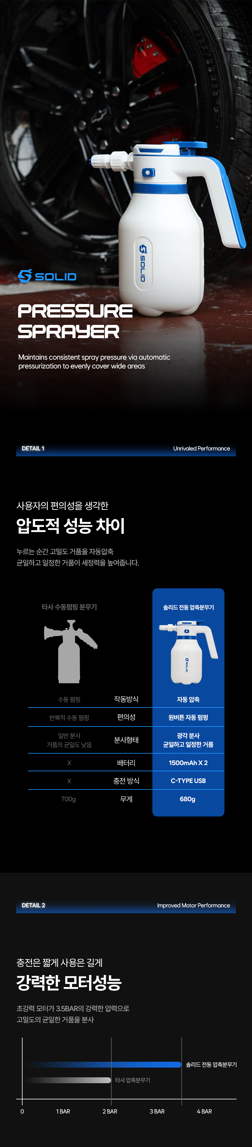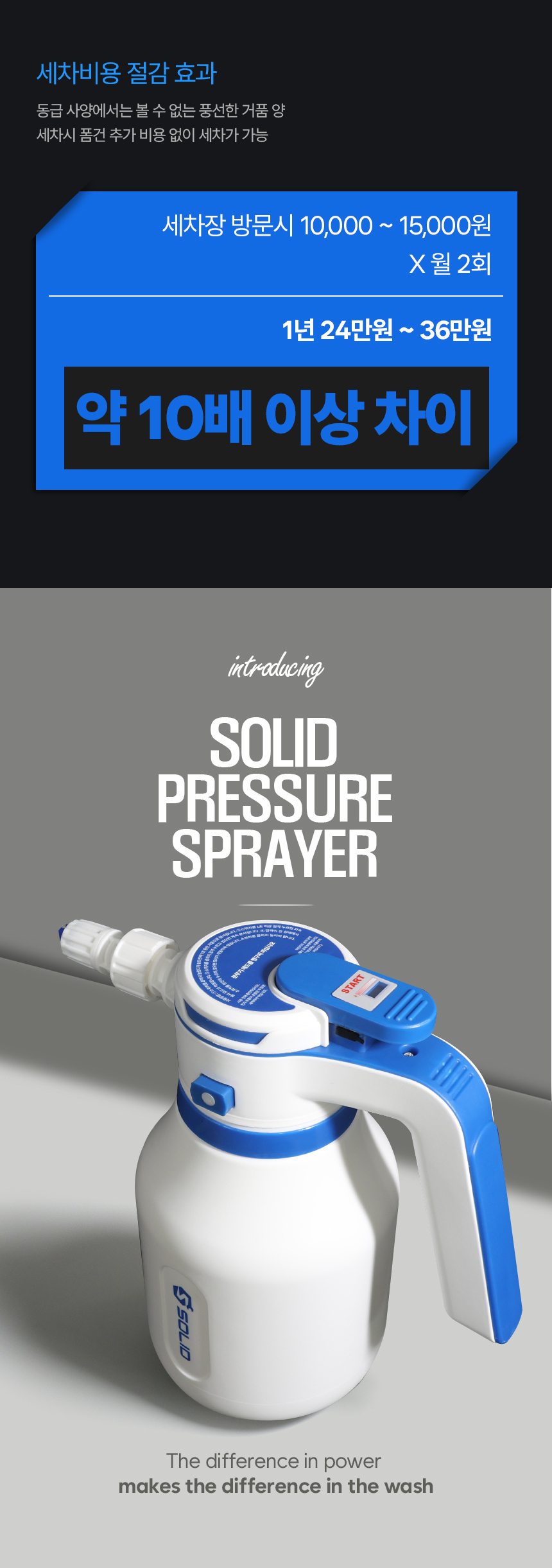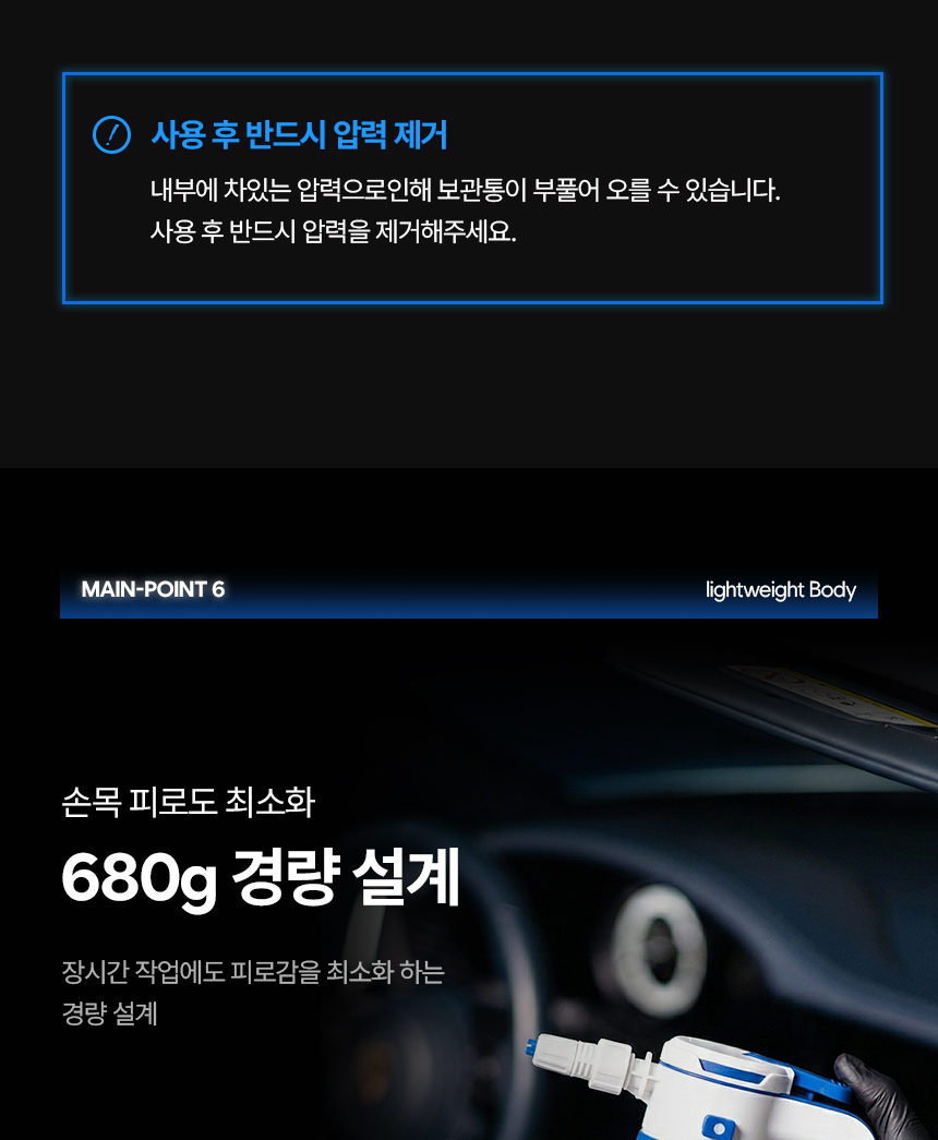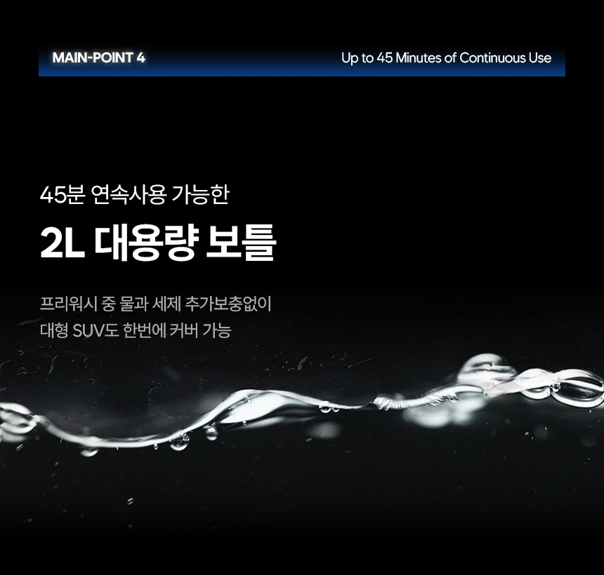 | 8. 주요 사양 | 3.5bar의 강력한 자동압축 , 균일하고 일정한 미세 분사 , 60˚의 광각 분사로 넓은 면적 커버가능 , 3중 내겹 보틀로 우수한 내구성 , 680g 경량 설계로 적은 피로도 , 45분 연속 사용으로 SUV도 한번에 세차가능. |