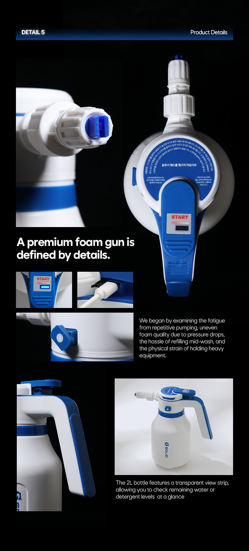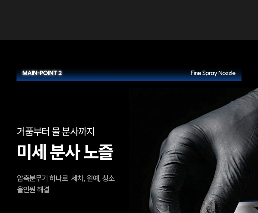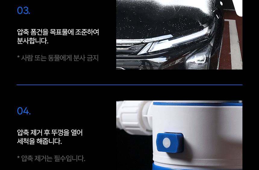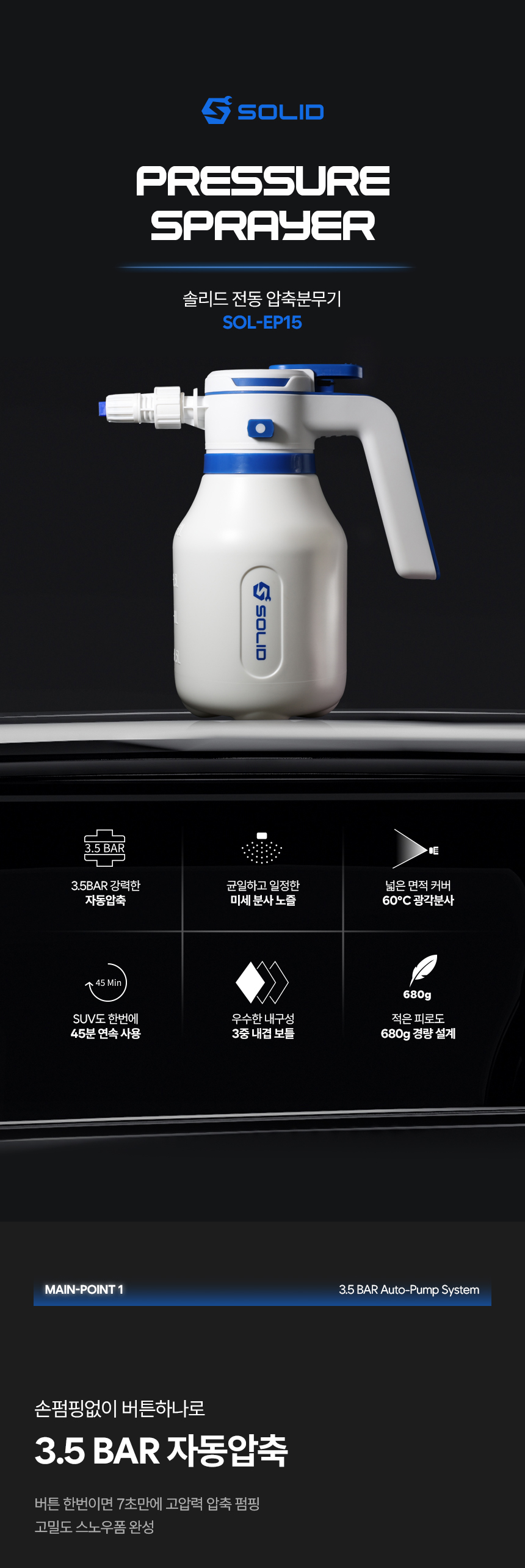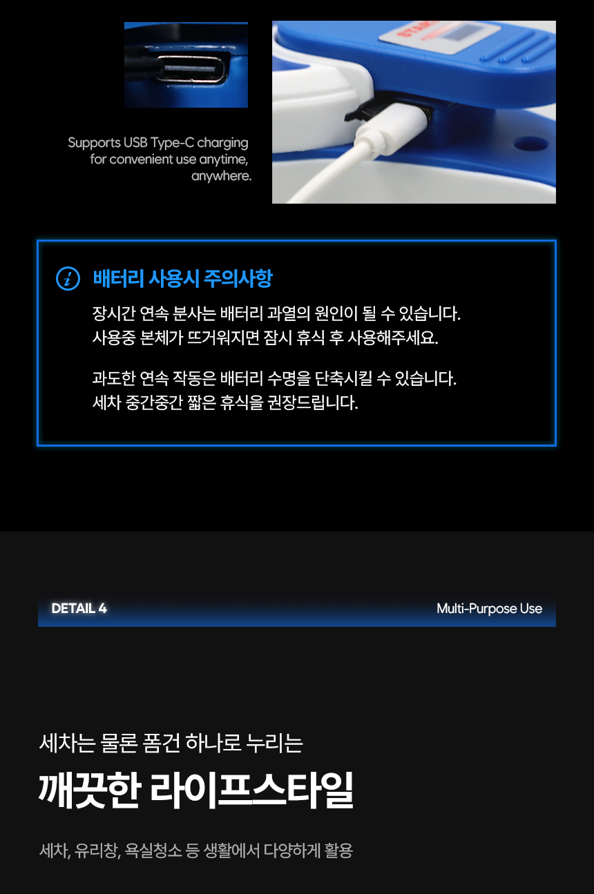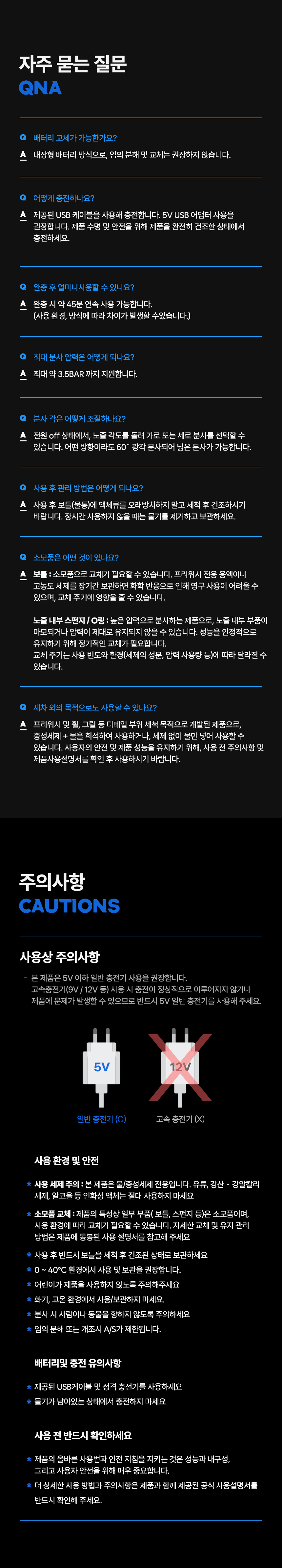 | 8. 주요 사양 | 3.5bar의 강력한 자동압축 , 균일하고 일정한 미세 분사 , 60˚의 광각 분사로 넓은 면적 커버가능 , 3중 내겹 보틀로 우수한 내구성 , 680g 경량 설계로 적은 피로도 , 45분 연속 사용으로 SUV도 한번에 세차가능. |