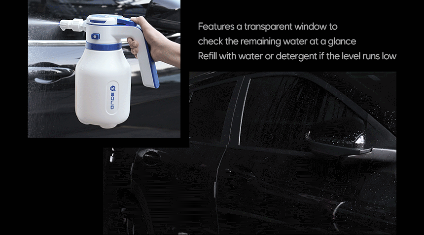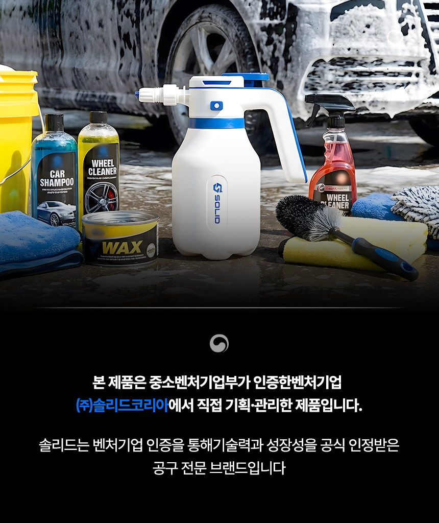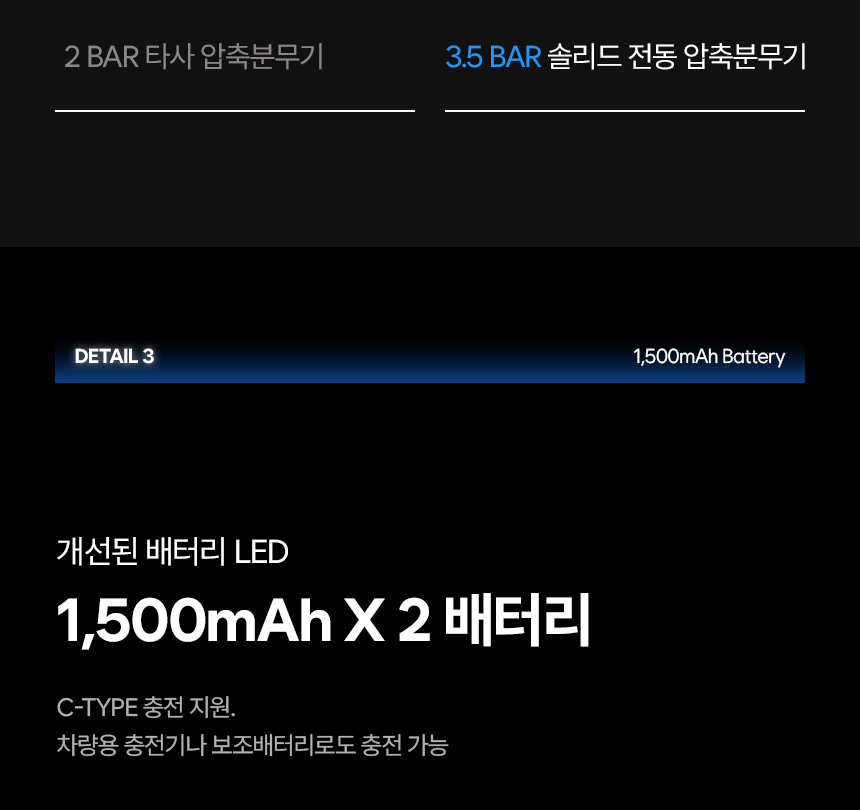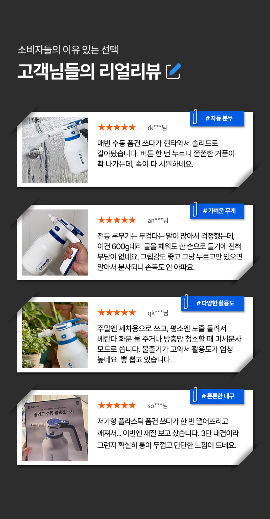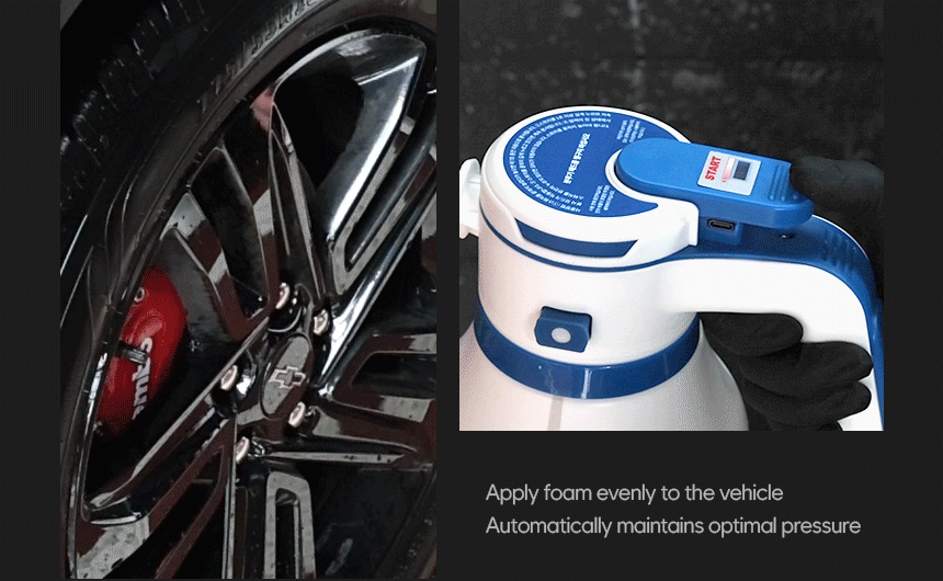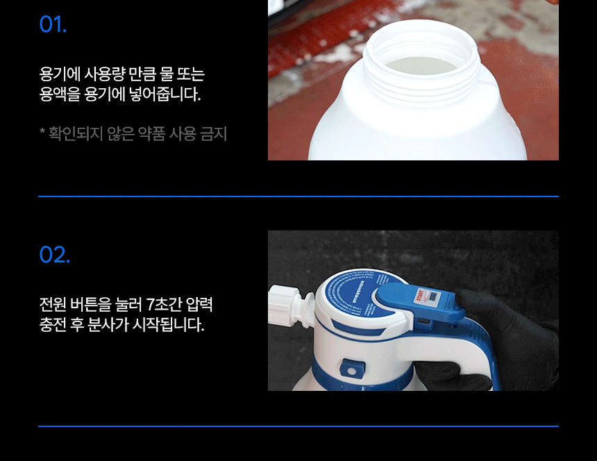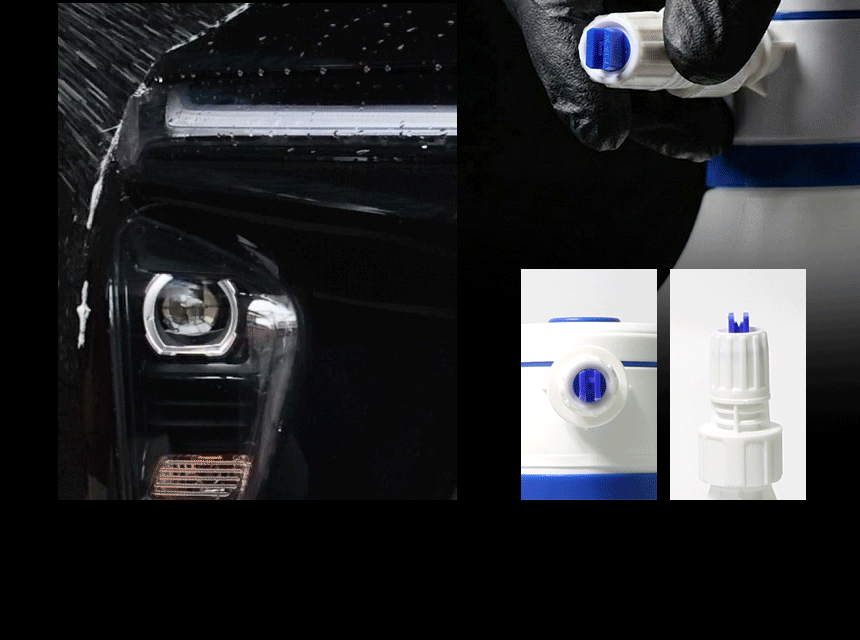 | 8. 주요 사양 | 3.5bar의 강력한 자동압축 , 균일하고 일정한 미세 분사 , 60˚의 광각 분사로 넓은 면적 커버가능 , 3중 내겹 보틀로 우수한 내구성 , 680g 경량 설계로 적은 피로도 , 45분 연속 사용으로 SUV도 한번에 세차가능. |