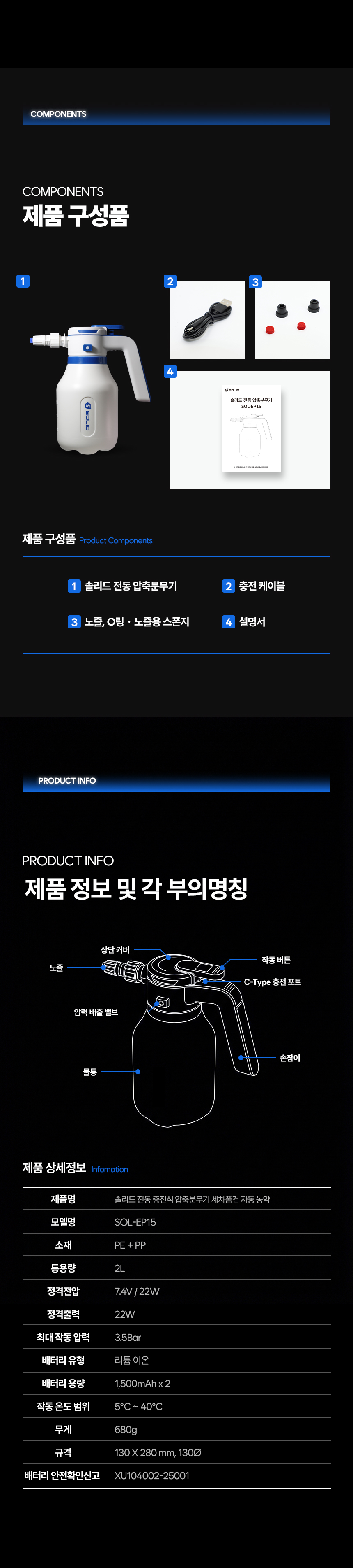| 1. 품명 및 모델명 | 솔리드 전동 충전식 압축분무기 세차폼건 자동 농약 무선 2L SOL-EP15 |