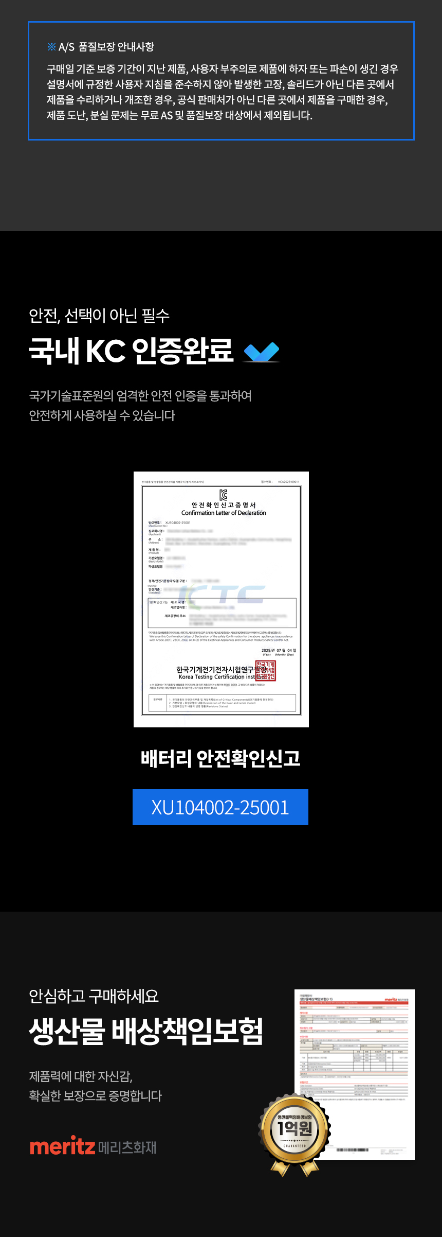 | 2. KC 인증 필 유무 (전파법 상 인증대상상품에 한함, MIC 인증 필 혼용 가능) | [KC전기용품 안전확인] 한국기계전기전자시험연구원(KTC) XU104002-25001 |