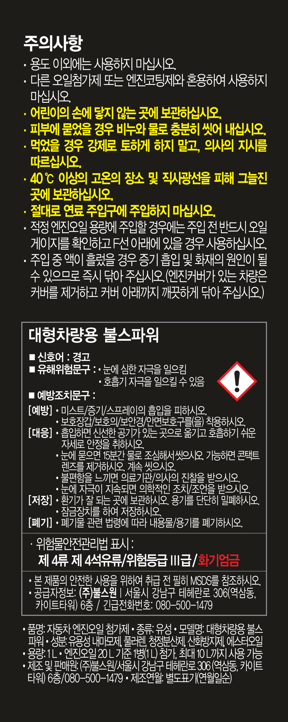 | 1. 품명 및 모델명 | • 품목 : 자동차 엔진오일 첨가제 • 모델명 : 불스파워 대형차량용 1L |