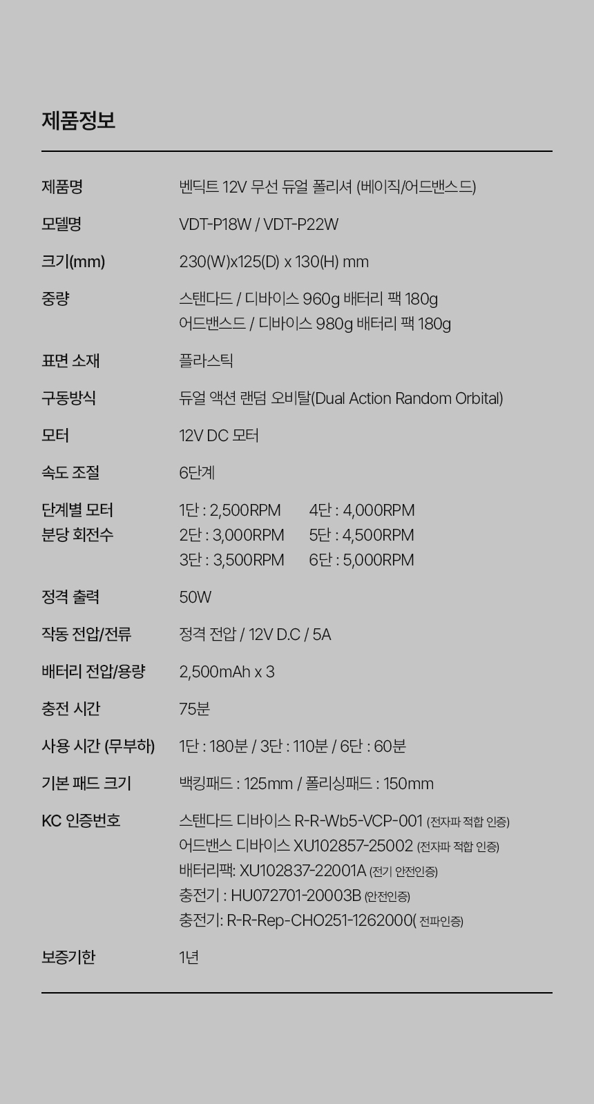 | 1. 품명 및 모델명 | 벤딕트 자동차 차량용 무선 듀얼 광택기 폴리싱 폴리셔 |