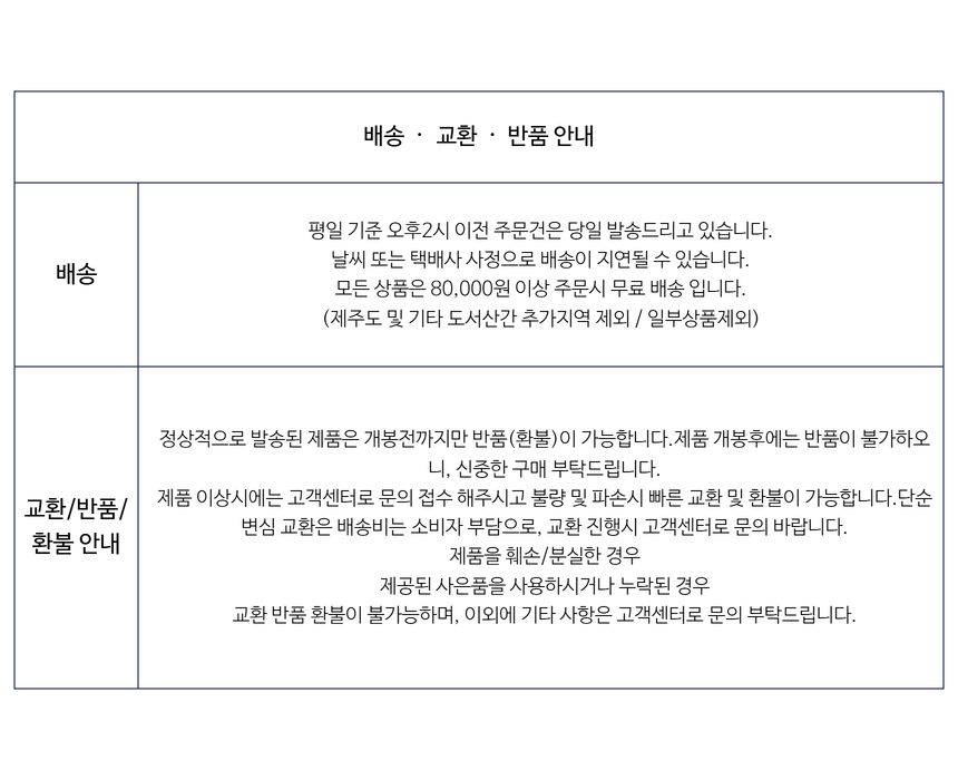 | 9. 품질보증기준 | 수령후 7일이내 반품 및 교환이 가능합니다. |