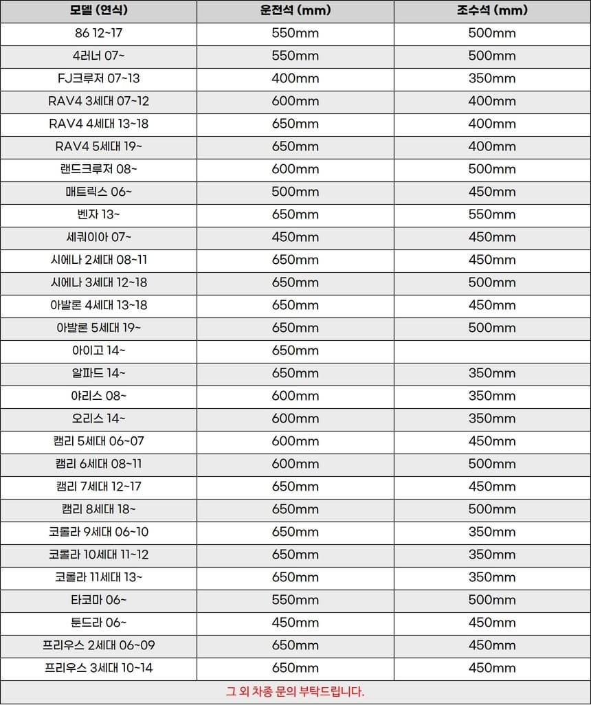 | 7. 적용차종 | 현대자동차,기아자동차,제네시스,쉐보레,쌍용,르노삼성,도요타,렉서스,혼다,인피니티,닛산,포드,지프,캐딜락 |