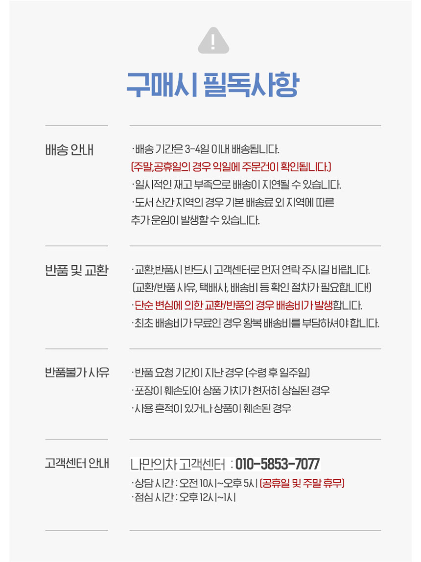 | 4. 제조자, 수입품의 경우 수입자를 함께 표기 (병행수입의 경우 병행수입 여부로 대체 가능) | 수입자 나만의차 |