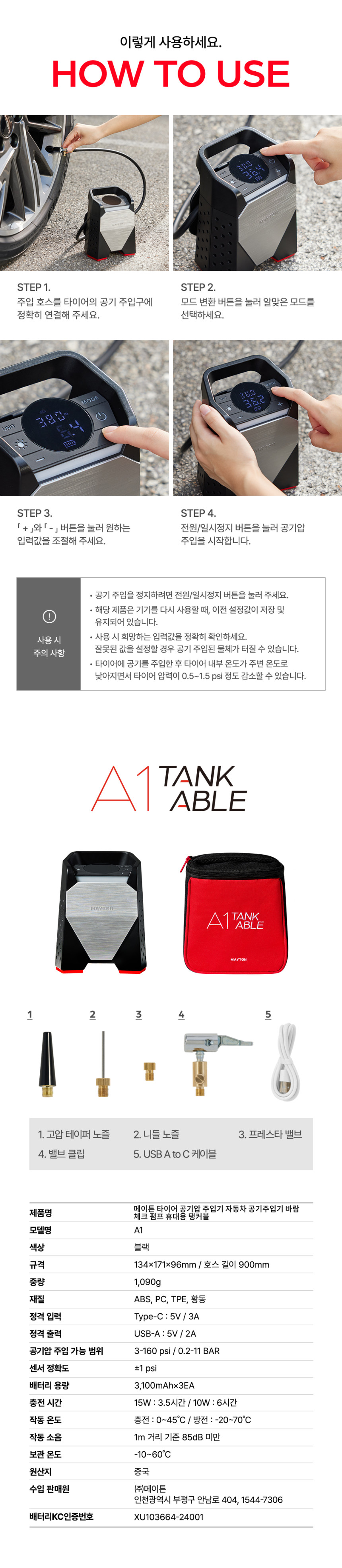 | 1. 품명 및 모델명 | 메이튼 탱커블 A1 공기압 주입기 |