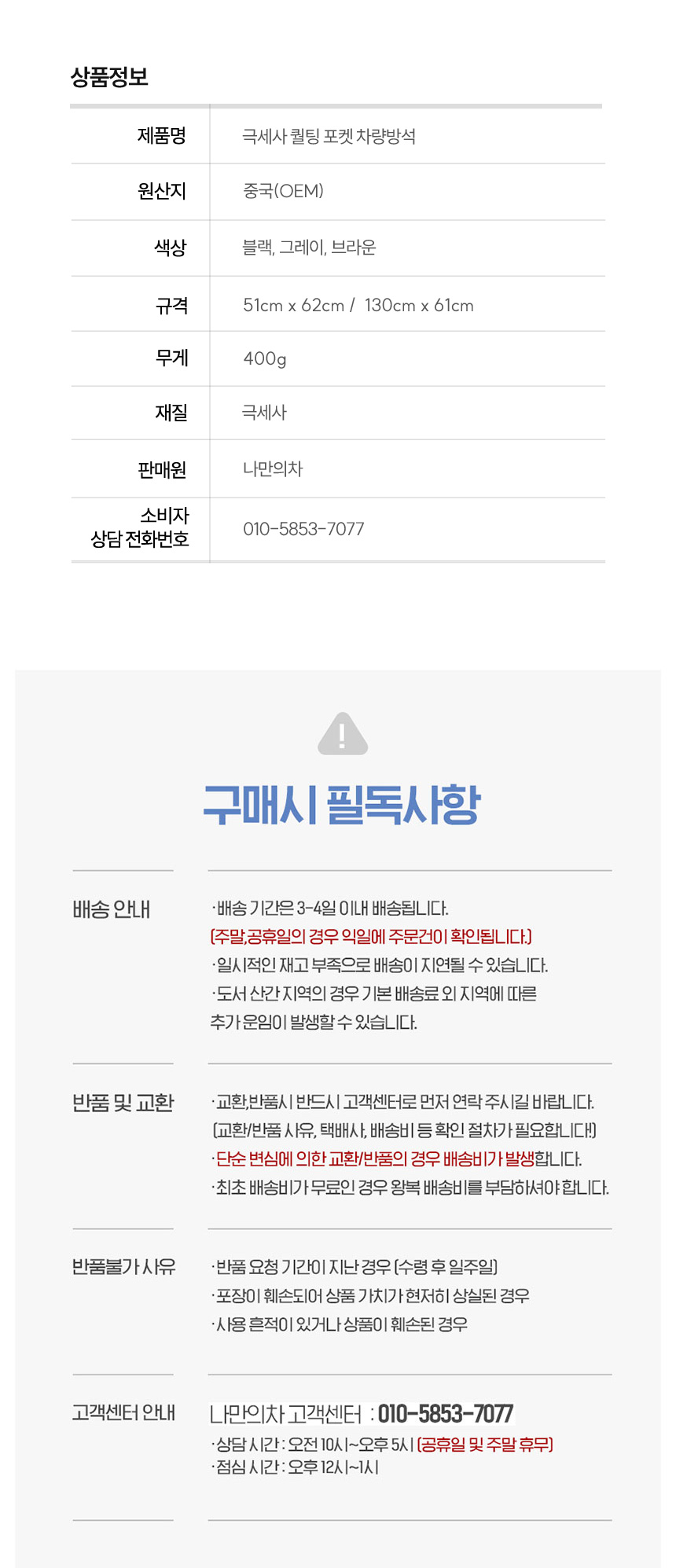 | 1. 품명 및 모델명 | 극세사 퀄팅 포켓 차량용 방석 |