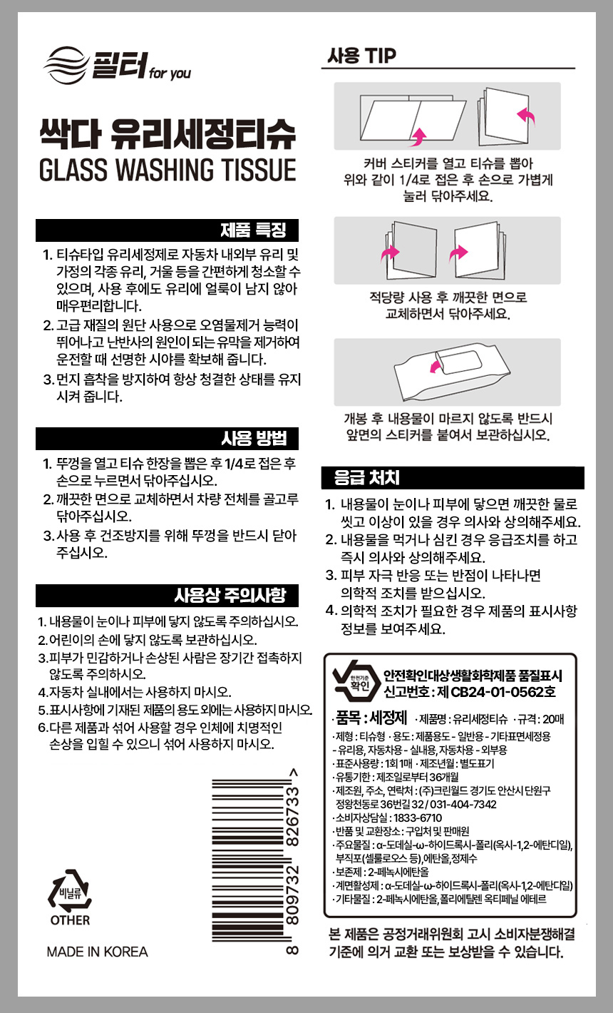 | 1. 품목 및 제품명 | 싹다 유리세정티슈 |