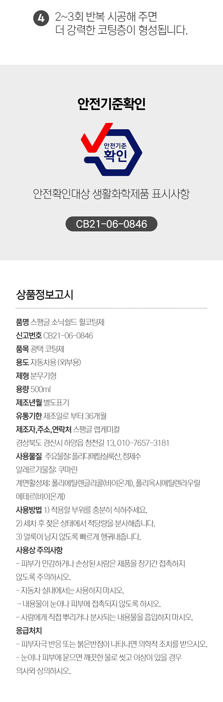 | 10. 안전기준 적합확인 신고번호(자가검사번호) 또는 안전확인대상 생활화학제품 승인번호 | CB21-06-0846 |