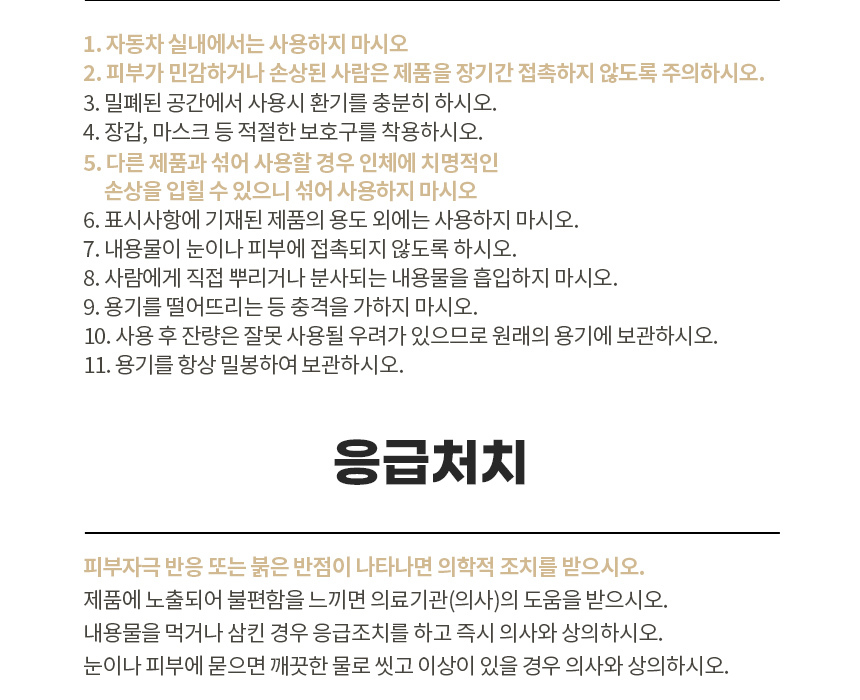 | 9. 사용상 주의사항 | 자동차 실내에서는 사용하지 마시오 피부가 민감하거나 손상된 사람은 제품을 장기간 접촉하지 않도록 주의하시오. 밀폐된 공간에서 사용시 환기를 충분히 하시오. 장갑 등 적절한 보호구를 착용하시오. 다른 제품과 섞어 사용할 경우 인체에 치명적인 손상을 입힐 수 있으니 섞어 사용하지 마시오. 표시사항에 기재된 제품의 용도 외에는 사용하지 마시오. 내용물이 눈이나 피부에 접촉되지 않도록 하시오. 사람에게 직접 뿌리거나 분사되는 내용물을 흡입하지 마시오. 용기를 떨어뜨리는 등 충격을 가하지 마시오. 사용 후 잔량은 잘못 사용될 우려가 있으므로 원래의 용기에 보관하시오. 용기를 항상 밀봉하여 보관하시오. |