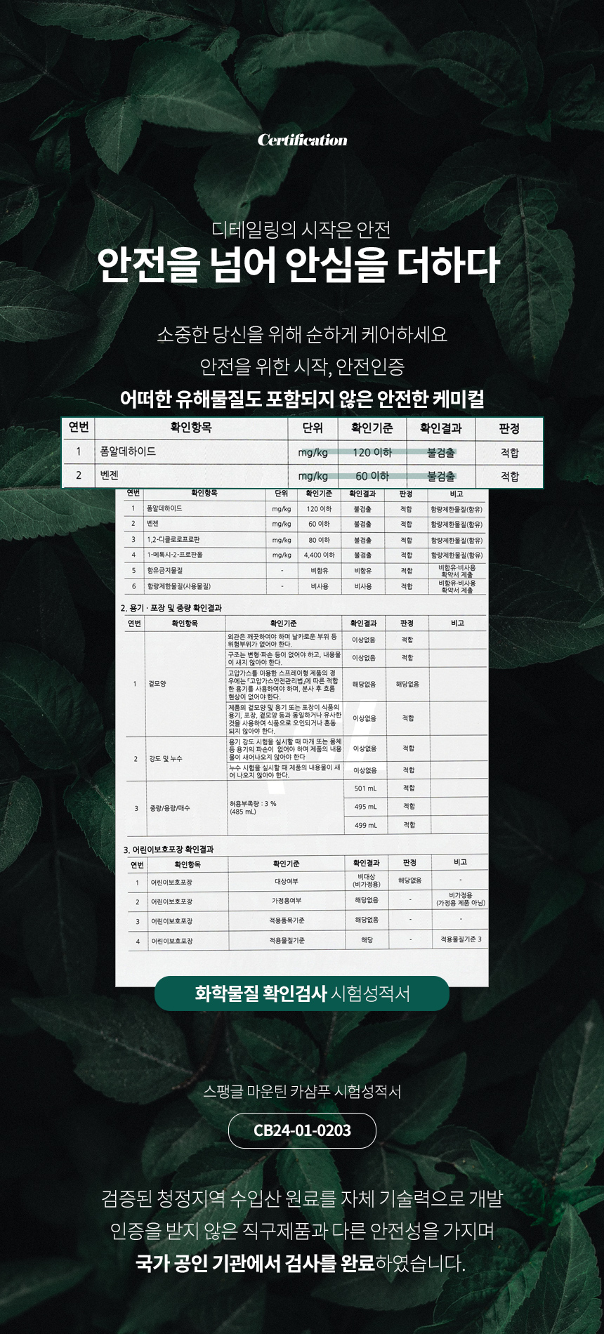 | 10. 안전기준 적합확인 신고번호(자가검사번호) 또는 안전확인대상 생활화학제품 승인번호 | 젠틀맨폼샴푸 : CB21-01-1148 스팽글카샴푸 : CB23-01-0201 마운틴카샴푸 : CB24-01-0203 |
