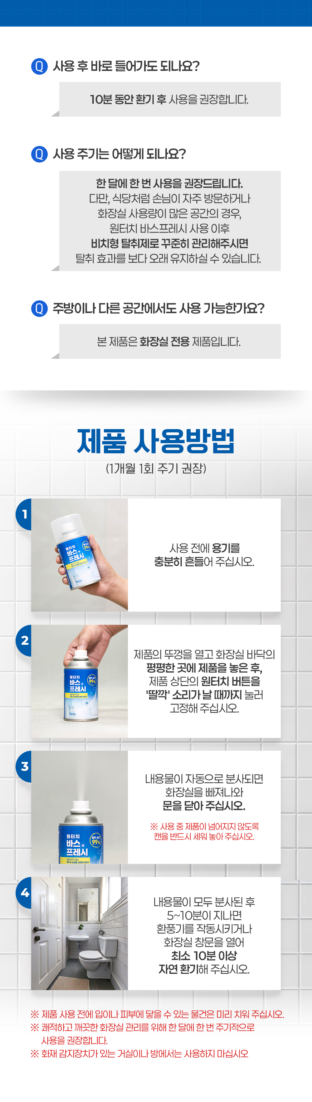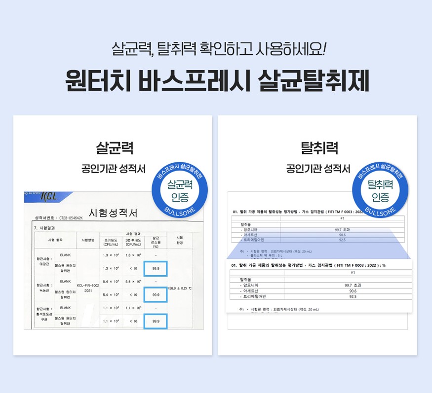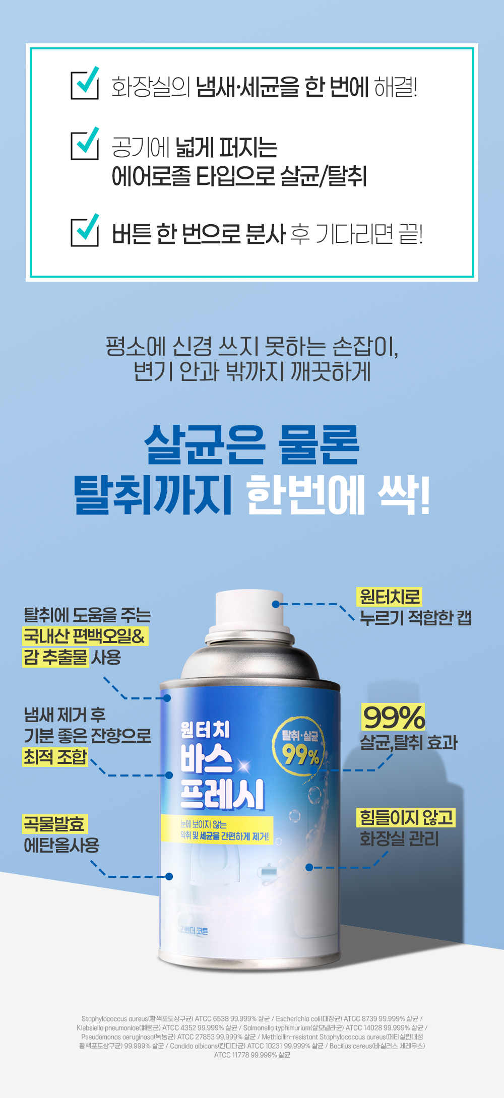 | 1. 품목 및 제품명 | • 품목 : 탈취제, 살균제 • 제품명 : 원터치 바스프레시 라벤더 코튼향 |