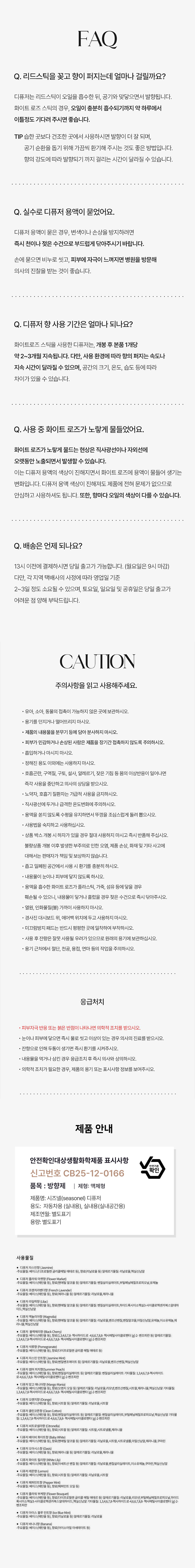 | 8. 제품에 사용된 화학물질 명칭(주요물질, 보존제 등 관련 고시에 따른 표시의무 화학물질에 한함) | 시즈넬(seasonel) 디퓨져 맥놀리아(Magnolia) 주요물질: 베이스(에탄올 등), 향료(펜에틸 알코올 등) 알레르기물질: 리날로올, 벤조산벤질, 벤질알코올, 아밀신남알, 유제놀, 이소유제놀, 제라니올, 헥실신남알 시즈넬(seasonel) 디퓨져 바나나(Banana) 주요물질: 베이스(에탄올 등), 향료(아이소아밀 아세테이트 등) 시즈넬(seasonel) 디퓨져 아이스 블루 민트(Ice Blue Mint) 주요물질: 베이스(에탄올 등), 향료(리날로올 등) 알레르기물질: 리날로올 시즈넬(seasonel) 디퓨져 라일락(Lilac) 주요물질: 베이스(에탄올 등), 향료(펜에탄올 등) 알레르기물질: 벤질살리실레이트, 하이드록시이소헥실3-사이클로헥센카복스알데하이드, 헥실신남알 시즈넬(seasonel) 디퓨져 레몬(Lemon) 주요물질: 베이스(에탄올 등), 향료(리날로올 등) 알레르기물질: 리날로올, 시트랄 시즈넬(seasonel) 디퓨져 망고 매니아(Mango Mania) 주요물질: 베이스(에탄올 등), 향료(오렌지 오일 등) 알레르기물질: 리날로올, 리모넨, 벤조산벤질, 시트랄, 제라니올, 헥실신남알 기타물질: 1,3,4,6,7,8-헥사하이드로-4,6,6,7,8,8-헥사메틸사이클로펜타[g]-2-벤조피란 시즈넬(seasonel) 디퓨져 베이비 화이트(Baby White) 주요물질: 베이스(에탄올 등), 향료(펜에틸 알코올 등) 알레르기물질: 리날로올, 시트랄, 시트로넬롤, 아밀신남알, 제라니올, 쿠마린 시즈넬(seasonel) 디퓨져 블랙체리(Black Cherry) 주요물질: 베이스(에탄올 등), 향료(시스-3-헥센-1-올 등) 기타물질: 1,3,4,6,7,8-헥사하이드로-4,6,6,7,8,8-헥사메틸사이클로펜타[g]-2-벤조피란 시즈넬(seasonel) 디퓨져 석류(Pomegranate) 주요물질: 베이스(에탄올 등), 향료(다이프로필렌글라이콜 등) 시즈넬(seasonel) 디퓨져 썸머피치(Summer Peach) 주요물질: 베이스(에탄올 등), 향료(벤질살리실레이트 등) 알레르기물질: 리모넨, 벤질살리실레이트, 제라니올 기타물질: 1,3,4,6,7,8-헥사하이드로-4,6,6,7,8,8-헥사메틸사이클로펜타[g]-2-벤조피란, 아세트산 에틸 시즈넬(seasonel) 디퓨져 씨트로넬라(Citronella) 주요물질: 베이스(에탄올 등), 향료(시트랄 등) 알레르기물질: 시트랄, 시트로넬롤, 제라니올 시즈넬(seasonel) 디퓨져 애플파이(Apple Pie) 주요물질: 베이스(에탄올 등), 향료(2-Methyl-3-phenyl-2-propenal; α-Methylcinnamic aldehyde 등) 알레르기물질: 유제놀 시즈넬(seasonel) 디퓨져 오렌지(Orange) 주요물질: 베이스(에탄올 등), 향료(다이프로필렌 글리콜 메틸 에테르 등) 알레르기물질: 리날로올, 시트랄 시즈넬(seasonel) 디퓨져 오아시스(Oasis) 주요물질: 베이스(에탄올 등), 향료(테르피네올 등) 알레르기물질: 리날로올, 제라니올 시즈넬(seasonel) 디퓨져 자스민 민트(Jasmine Mint) 주요물질: 베이스(에탄올 등), 향료(디옥틸아디페이트 등) 알레르기물질: 리날로올, 벤조산벤질, 헥실신남알 시즈넬(seasonel) 디퓨져 자스민(Jasmine) 주요물질: 베이스(에탄올 등), 향료(리날로올 등) 알레르기물질: 리날로올, 헥실신남알 시즈넬(seasonel) 디퓨져 클린코튼(Clean Cotton) 주요물질: 베이스(에탄올 등), 향료(헥실신남알 등) 알레르기물질: 벤질살리실레이트, 부틸페닐메칠프로피오날, 헥실신남알 기타물질: 1,3,4,6,7,8-헥사하이드로-4,6,6,7,8,8-헥사메틸사이클로펜타[g]-2-벤조피란 시즈넬(seasonel) 디퓨져 페퍼민트(Peppermint) 주요물질: 베이스(에탄올 등), 향료(프로필렌글리콜 등) 시즈넬(seasonel) 디퓨져 프렌치 라벤더(French Lavender) 주요물질: 베이스(에탄올 등), 향료(리날로올 등) 알레르기물질: 리날로올, 제라니올 시즈넬(seasonel) 디퓨져 플라워 마켓(Flower Market) 주요물질: 베이스(에탄올 등), 향료(펜에탄올 등) 알레르기물질: 벤질살리실레이트, 부틸페닐메칠프로피오날, 유제놀 시즈넬(seasonel) 디퓨져 플라워 부케(Flower Bouquet) 주요물질: 베이스(에탄올 등), 향료(다이프로필렌글리콜메틸에테르 등) 알레르기물질: 리날로올, 리모넨, 부틸페닐메칠프로피오날, 하이드록시이소헥실3-사이클로헥센카복스알데하이드, 헥실신남알 기타물질: 1,3,4,6,7,8-헥사하이드로-4,6,6,7,8,8-헥사메틸사이클로펜타[g]-2-벤조피란 시즈넬(seasonel) 디퓨져 화이트 릴리(White Lily) 주요물질: 베이스(에탄올 등), 향료(벤질살리실레이트 등) 알레르기물질: 리날로올, 벤질살리실레이트, 이소유제놀, 쿠마린, 헥실신남알 |