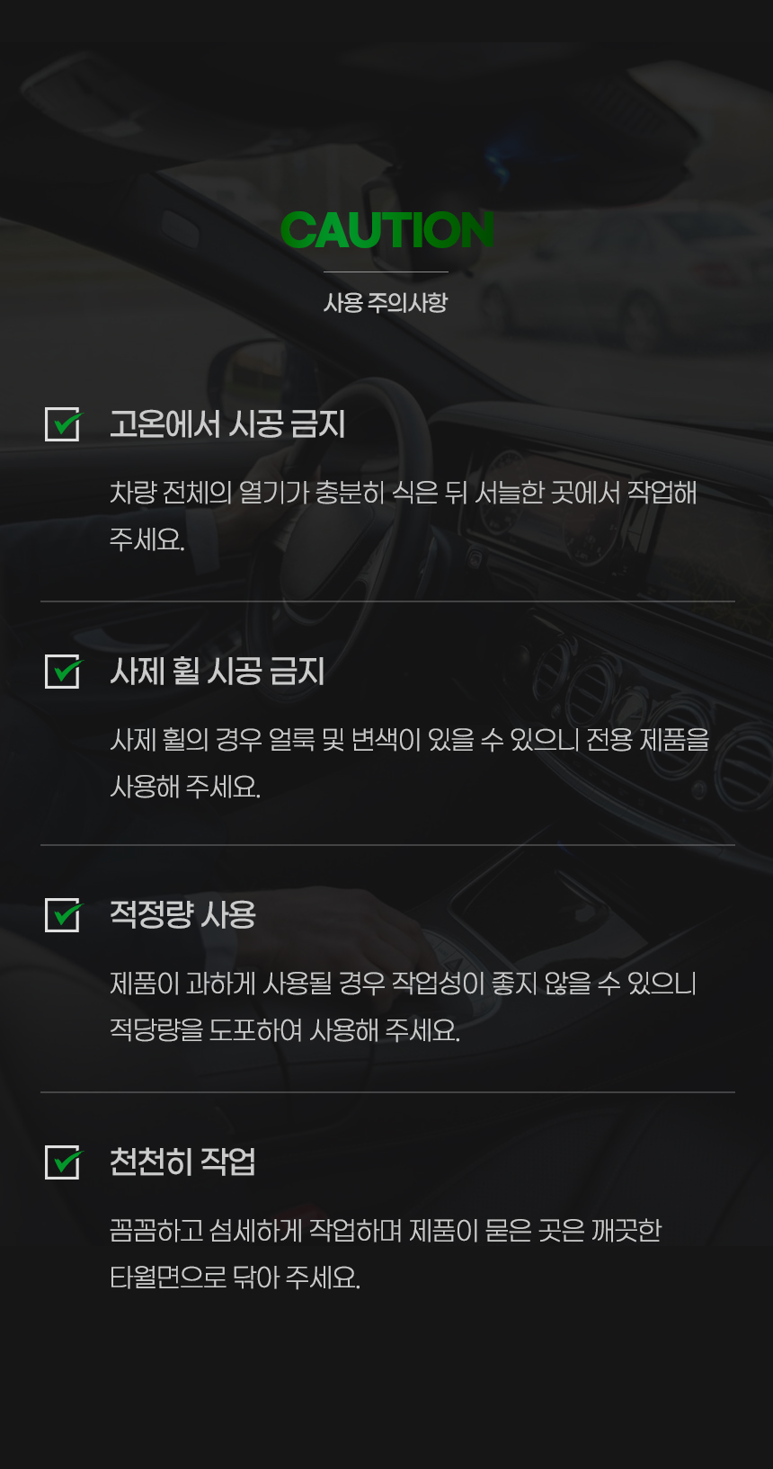 | 2. 용도(표백제의 경우 계열을 함께 표시) 및 제형 | 세정제-일반용(기타표면세정용(유리용 금속용 플라스틱용, 고무용) 자동차용(외부용) 제거제-일반용(타르기름제거용, 기타제거용(이물 질, 찌든때 제거용)), 자동차용(외부용(이물질, 갈변 제거용) |