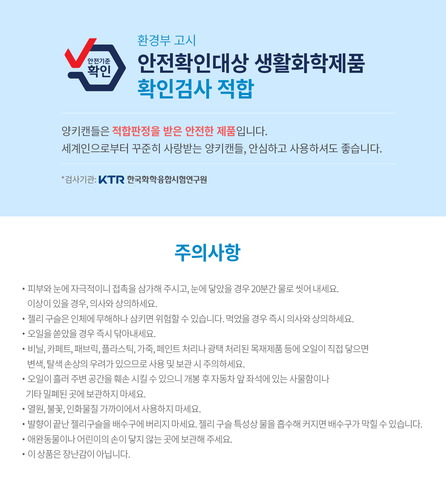 | 9. 사용상 주의사항 | ①피부가 민감하거나 손상된 사람은 제품을 장기간 접촉하지 않도록 주의하시오 ②어린이나 동물의 접촉이 가능한 곳에 두지 마십시오. ③제품이 옷감이나 차량의 표면에 직접 닿지 않게 하십시오 ④사용 방법을 숙지하고 사용하십시오. ⑤제품의 용도 외에는 사용하지 마십시오. |