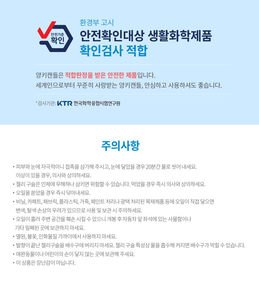 | 9. 사용상 주의사항 | ①피부가 민감하거나 손상된 사람은 제품을 장기간 접촉하지 않도록 주의하시오 ②어린이나 동물의 접촉이 가능한 곳에 두지 마십시오. ③제품이 옷감이나 차량의 표면에 직접 닿지 않게 하십시오 ④사용 방법을 숙지하고 사용하십시오. ⑤제품의 용도 외에는 사용하지 마십시오. |