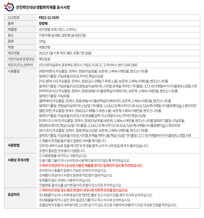 | 1. 품목 및 제품명 | 양키캔들 차량용방향제` |