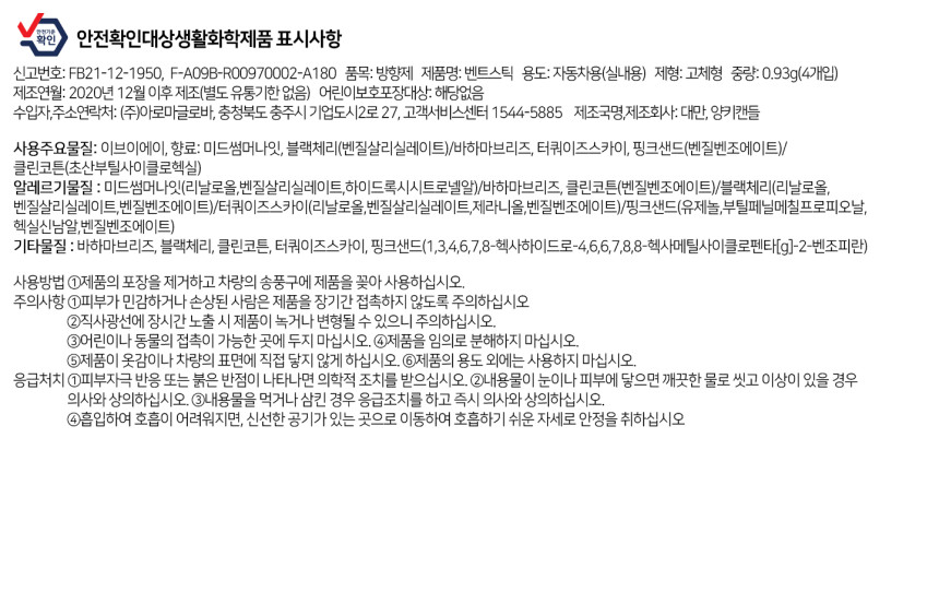 | 2. 용도(표백제의 경우 계열을 함께 표시) 및 제형 | 자동차용,실내방향제 |